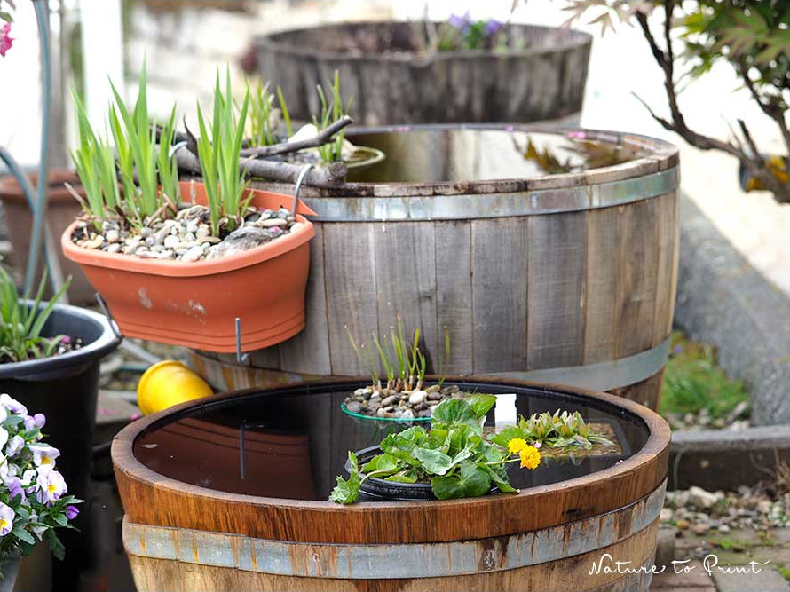 Drei unterschiedlich alte Holzfässer, verschieden genutzt: Mini-Wassergarten, Sumpfteich und Hochbeet mit Stauden.