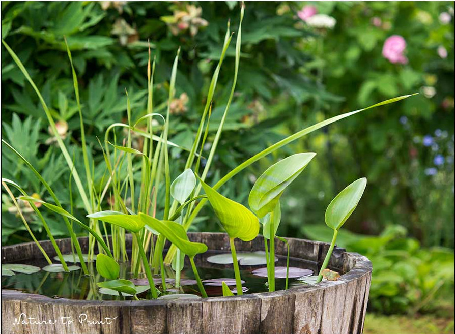 - Denken Sie Ihren kleinen Wassergarten weiter und bepflanzen Sie das Fass mit Blutweiderich, Sumpfschwertlilie oder Sumpfdotterblumen.